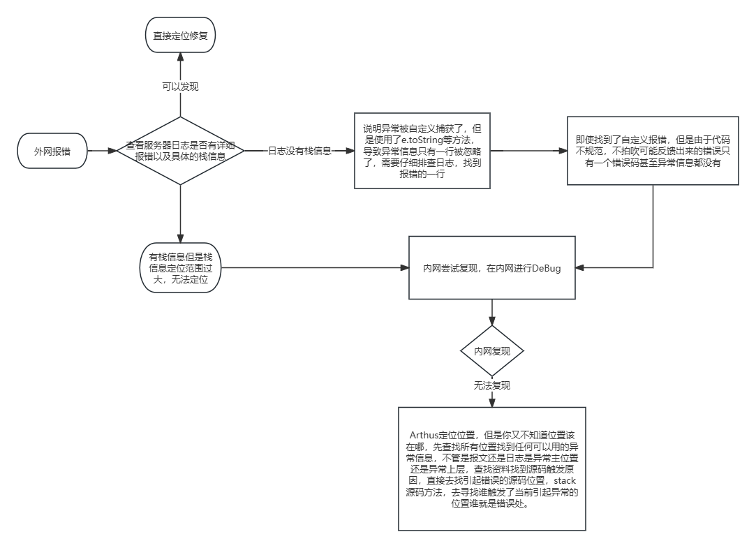 内网报错:先查看响应的具体错误和查内网日志,打印栈信息直接定位到目标代码位置。