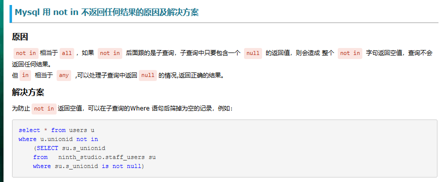 今天碰到一个SQL,由于条件很多所以不展示,只关注where的A not in B条件,在本地库测试的时候查询结果正确,但迁移到线上环境反馈查不出数据,手动select查看A数据,发现查出的某数据确实不在B中,那么为什么查不出呢?