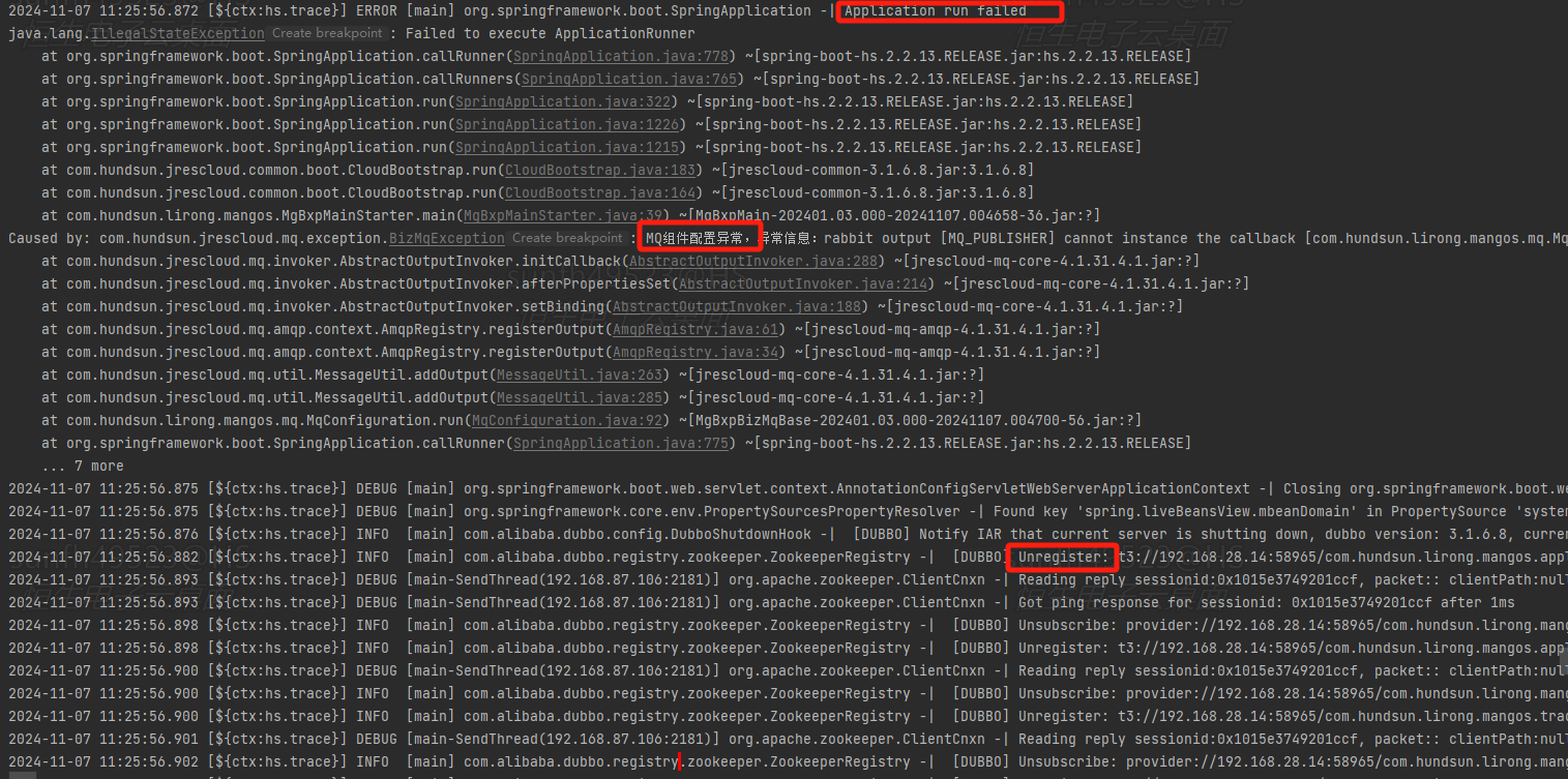 可以看到容器启动失败,原因是zookeeper注册失败,原因是MQ组件配置异常