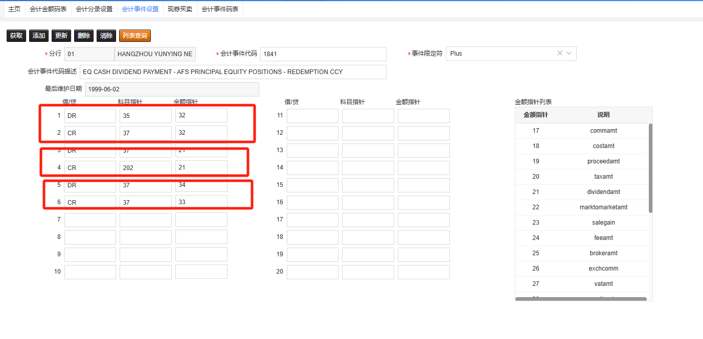 在Mangos中,也是这样设计的,重点在于会计事件这个属性,也就是对于某个交易来说,他的会计事件也就是这笔交易的记账方式,界面如下:
