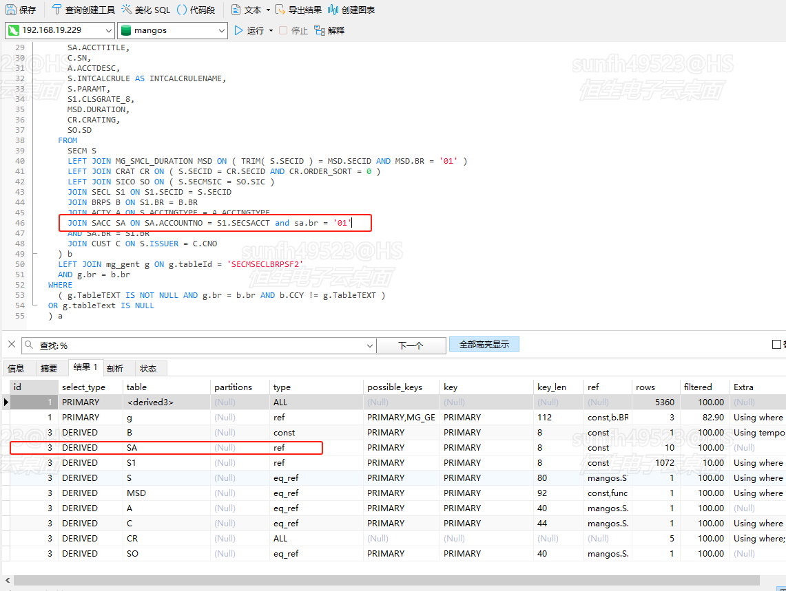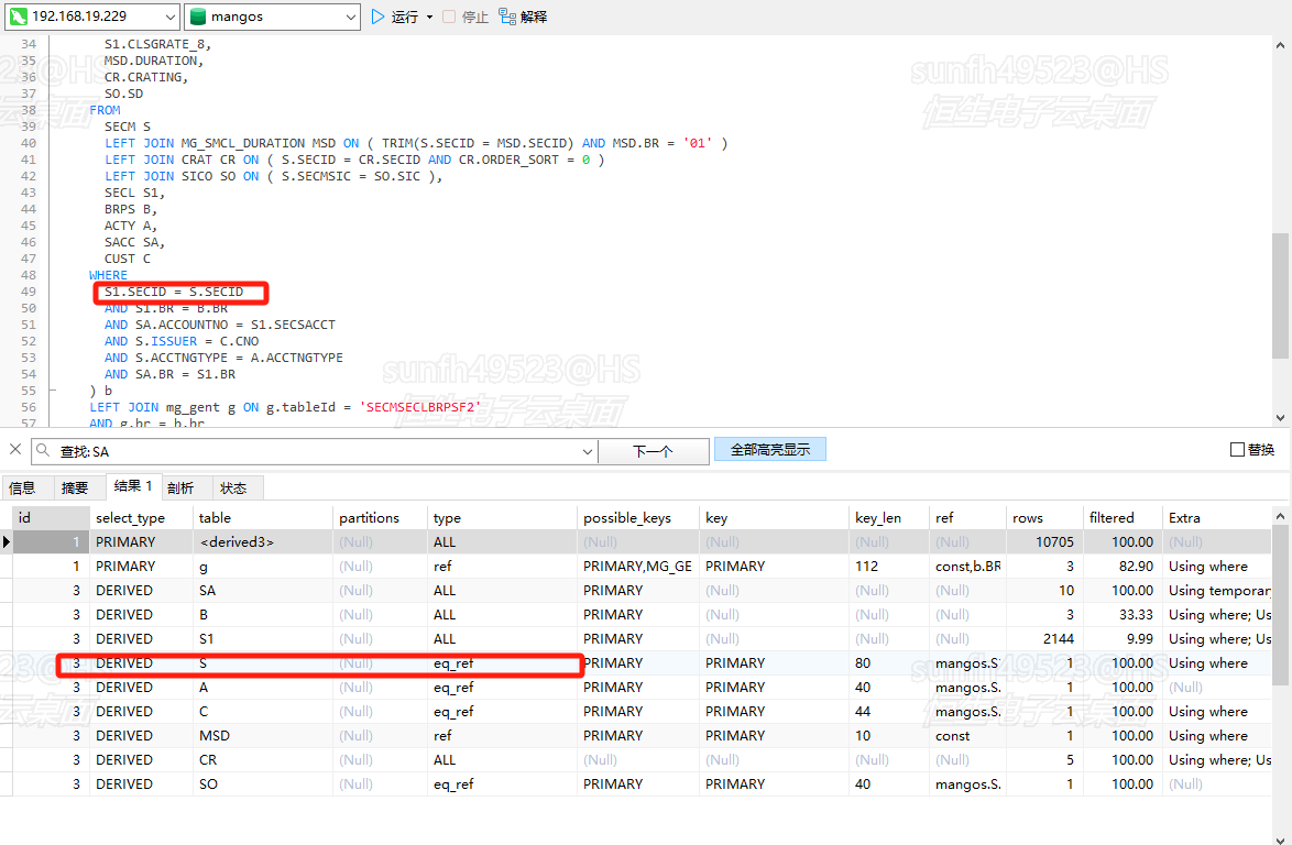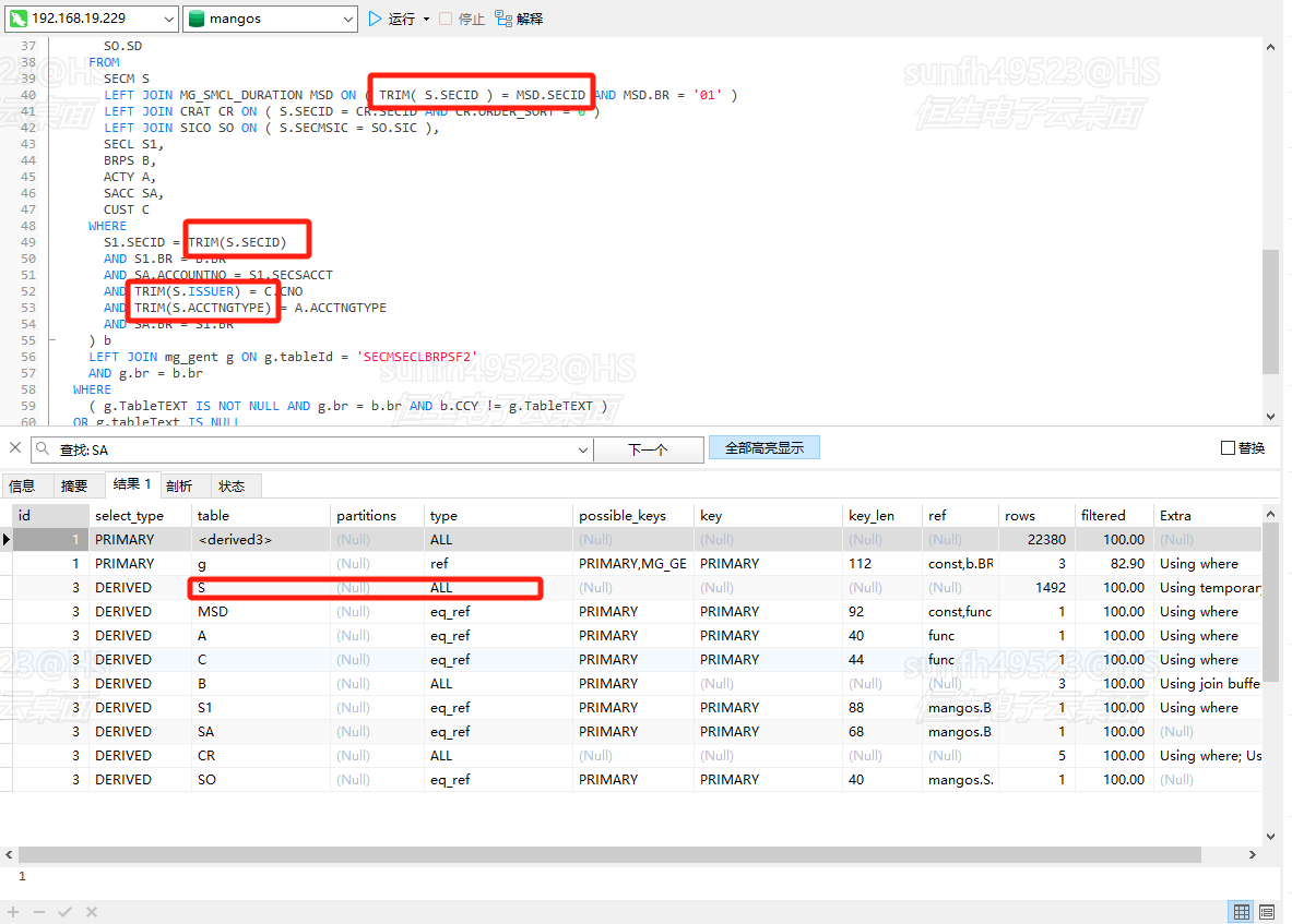 将S改为驱动表,因为SECID这个主键都是“表关联条件”,所以一定是ALL,这里只需要关注第一和第二个红框就可以了,因为issuer和acctype不是主键