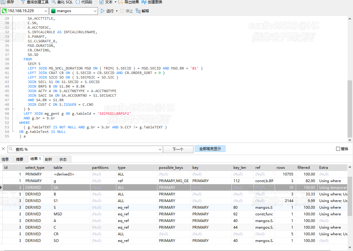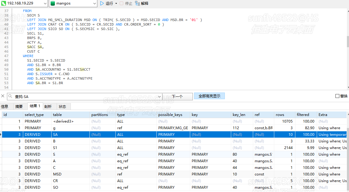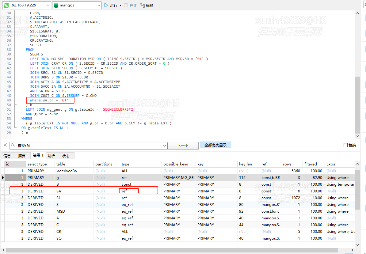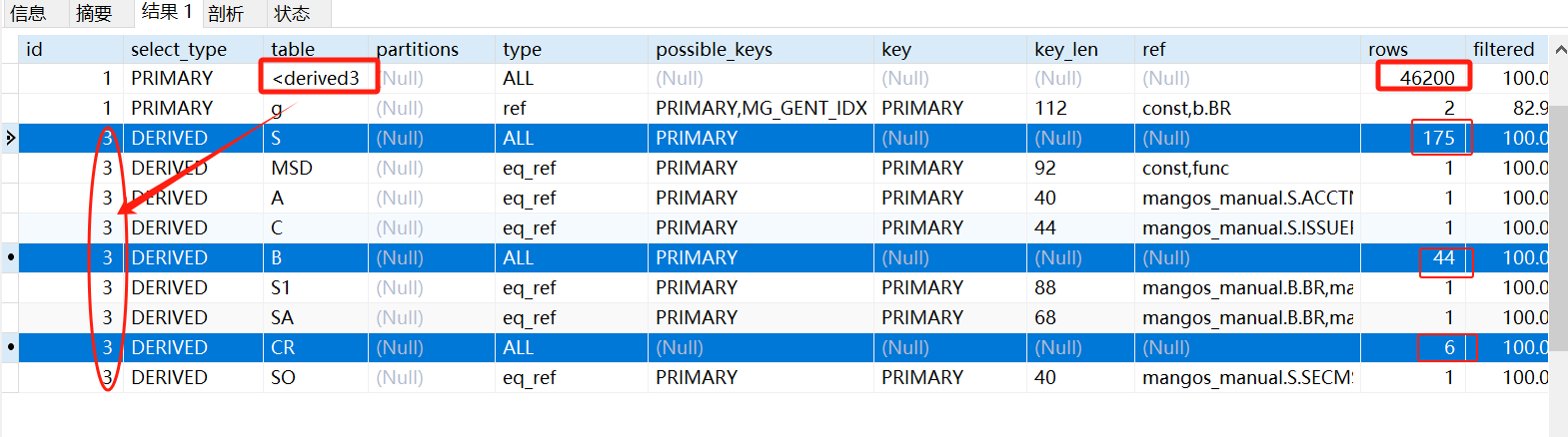 将S改为驱动表,因为SECID这个主键都是“表关联条件”,所以一定是ALL,这里只需要关注第一和第二个红框就可以了,因为issuer和acctype不是主键
